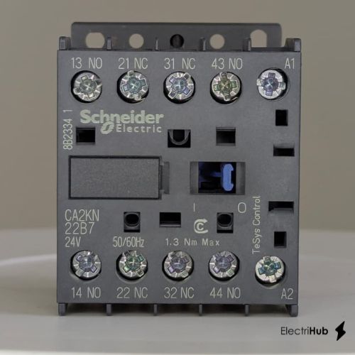 Schneider Auxiliary Contactor CA2KN22B7 offers long mechanical life cycles, making it reliable for repetitive switching applications. The datasheet available on ElectriHub provides precise lifecycle data.